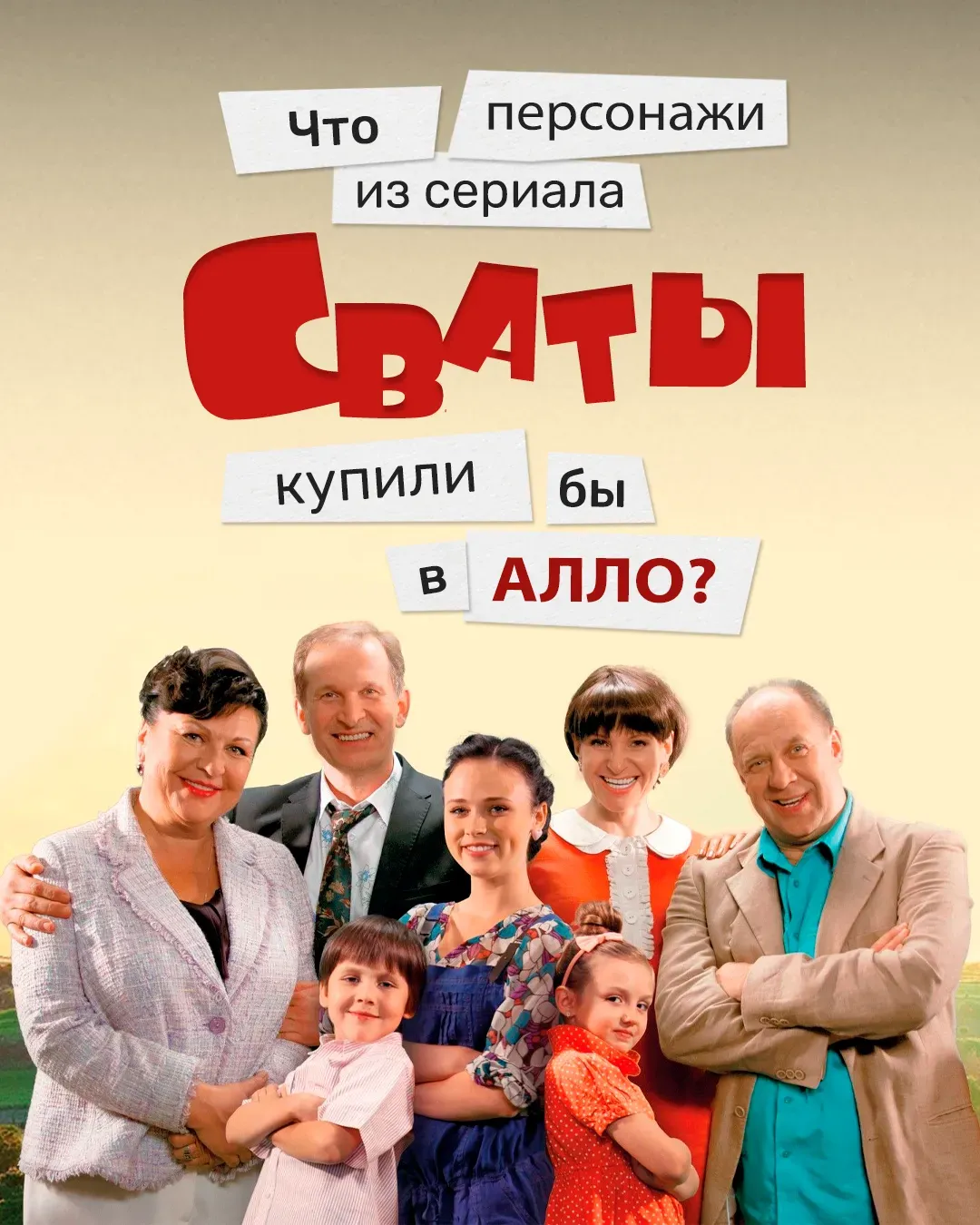 Выполнение: Разработала концепцию товарной подборки, основанной на ассоциациях с героями сериала «Сваты». Для каждого персонажа был подобран товар, который отражал бы их характер, привычки или сюжетные линии. Это создало эмоциональную связь с пользователями и позволило наглядно продемонстрировать товары в нестандартном ключе.
